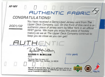 2001-02 UD SP Game Used Authentic Fabric Mike York č. AF-MY