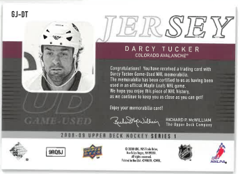 2008-09 UD Series 1 Game Jersey Darcy Tucker č. GJ-DT