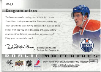 2011-12 UD Series 2 Rookie Jersey Materials Anton Lander č. RM-LA
