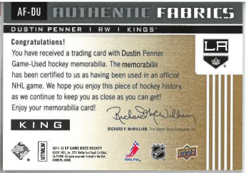 2011-12 UD SP Game Used Authentic Fabrics Dustin Penner č. AF-DU