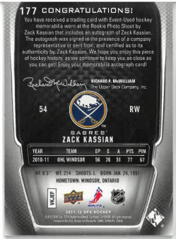 2011-12 UD SPx Autographed Rookie Jersey Zach Kassian /799 č. 177