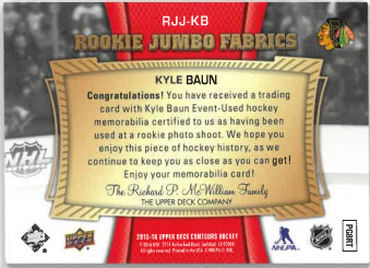 2015-16 UD Contours Rookie Jumbo Fabrics Kyle Baun č. RJJ-KB
