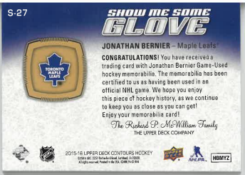 2015-16 UD Contours Show Me Some Glove Jonathan Bernier č. S-27