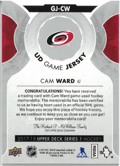 2017-18 UD Series 1 UD Game Jersey Cam Ward č. GJ-CW