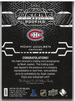 2018-19 UD Black Lustrous Rookie Noah Juulsen č. LR-NJ
