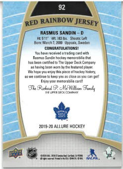 2019-20 UD Allure Red Rainbow Jersey Rasmus Sandin č. 92