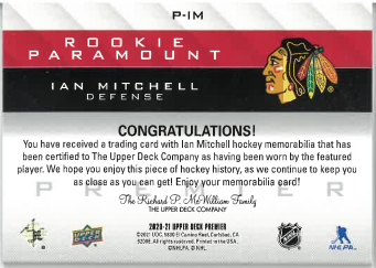2020-21 UD Premier Rookie Paramount Ian Mitchell č. P-IM