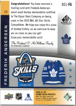 2020-21 UD SP Game Used 1ST Year All-Star Frederic Andersen č. AS1-FA