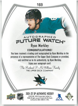 2021-22 UD SP Authentic Ryan Merkley Future Watch /999 č. 169