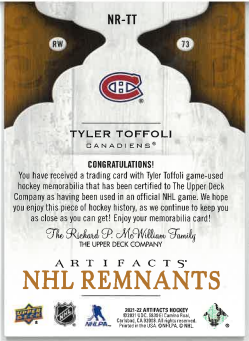 2021-22 UD Artifacts NHL Remants Tyler Toffoli č. NR-TT