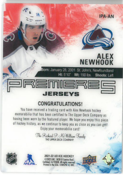 2021-22 UD Ice Alex Newhook Premieres Jerseys č. IPA-AN