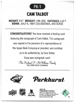 2021-22 UD Parkhurst Parkies Blue Autos Cam Talbot č. PK-1