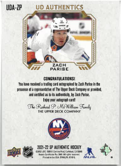 2021-22 UD SP Authentic UD Authentics Auto Zach Parise č. UDA-ZP