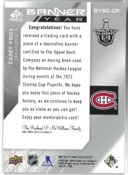 2021-22 UD SP Game Used Banner Year Carey Price č. BYSC-CP