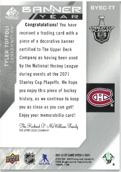 2021-22 UD SP Game Used Banner Year Tyler Toffoli č. BYSC-TT