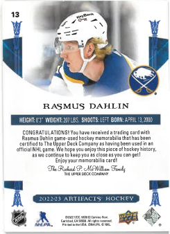 2022-23 UD Artifacts Gold Material Relics Rasmus Dahlin /249 č. 13