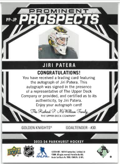 2023-24 UD Parkhurst Prominent Prospects Gold Jiri Patera Rookie Auto RC č. PP-JP