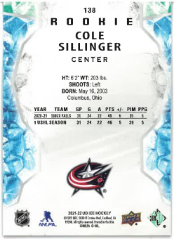 2021-22 UD Ice Green Rookie Cole Sillinger č. 138
