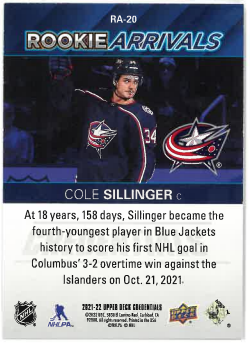 2021-22 UD Credentials Rookie Arrivals Cole Sillinger č. RA-20