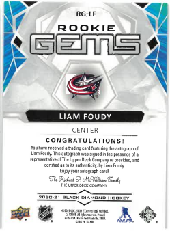 2020-21 UD Black Diamond Rookie Gems Auto Liam Foudy /199 č. RG-LF