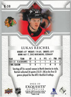 2022-23 UD Exquisite Rookie Lukas Reichel /349 č. R-30