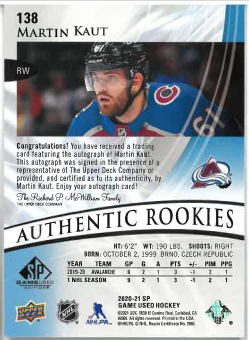 2020-21 UD SP Game Used Authentic Rookies Auto Martin Kaut č. 138