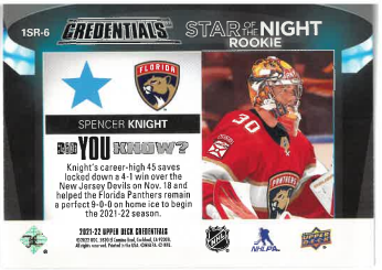 2021-22 UD Credentials Star of the Night Rookie Spencer Knight č. 1SR-6