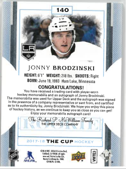 2017-18 UD The CUP Rookie Patch Auto Jonny Brodzinski /249 č. 140