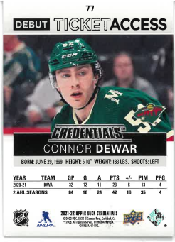 2021-22 UD Credentials Debut Ticket Acces Connor Dewar /999 č. 77