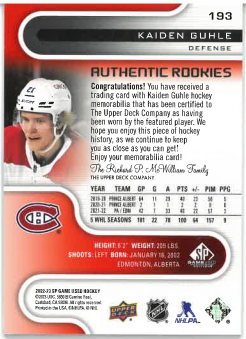 2022-23 UD SP Game Used Authentic Rookies Jersey Red Kaiden Guhle č. 193