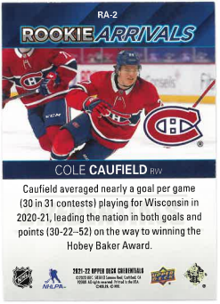 2021-22 UD Credentials Rookie Arrivals Cole Caufield č. RA-2
