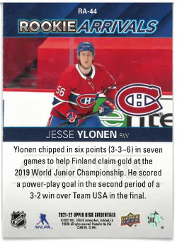 2021-22 UD SP Credentials Rookie Arrivals Jesse Ylonen č. RA-44