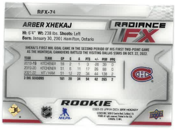 2022-23 UD SPx Radiance Blue Rookie FX Arber Xhekaj /399 č. RFX-74
