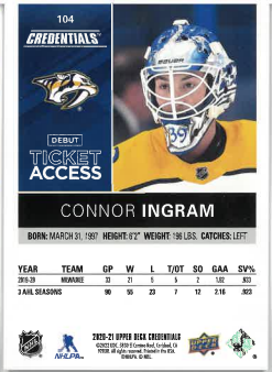 2020-21 UD Credentials Debut Ticket Access Connor Ingram /999 č. 104