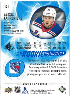 2020-21 UD SP Authentic Rookie Alexis Lafreniére č. 101