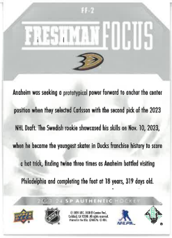 2023-24 UD SP Authentic Freshman Focus Leo Carlsson č. FF-2